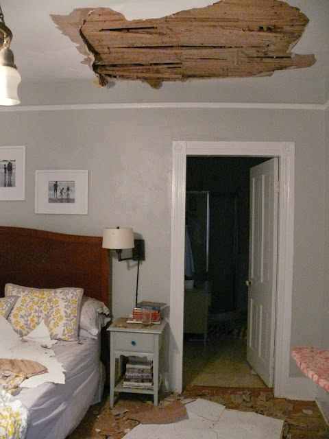 The CHUNK of ceiling hit the bed, and completely flipped over,