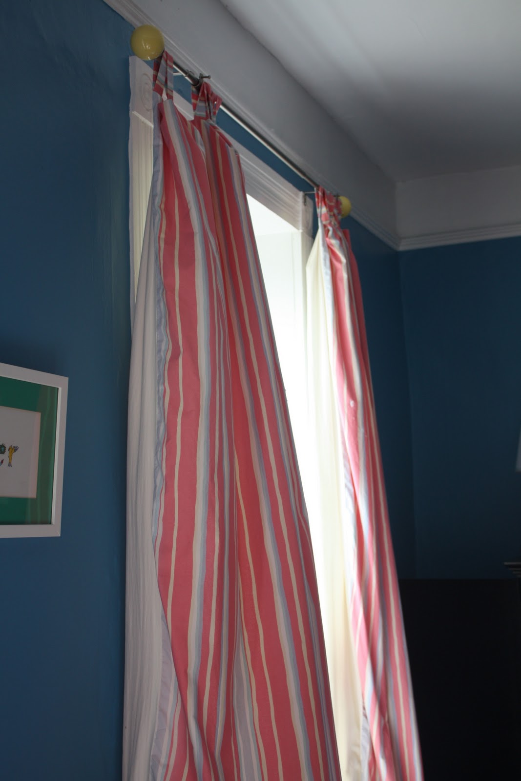 The custom made window treatments were an e-bay purchase when we moved into the house and the Orange Drum light was a score from Land of Nod.