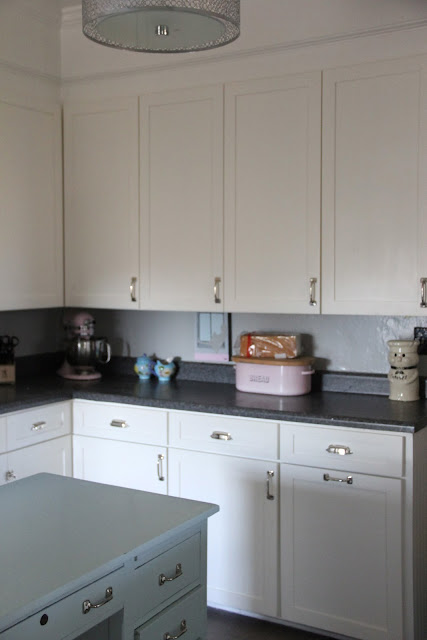 When it comes to the counters…I am not a fan of clutter, but there seem to be a fair amount of items that live on our countertops…whether I like ti or not. When Family Circle was here they fell in love with my pink coffee maker! Go figure…and I do like my pink bread box  (from Marshalls or Tj Maxx) and my aqua collander (same) .