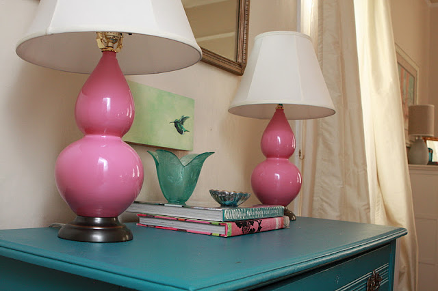 I have styled the dresser various ways…and have tried a few different lamps..presently I am using the Robert Abbey Pink ones…a Christmas gift!