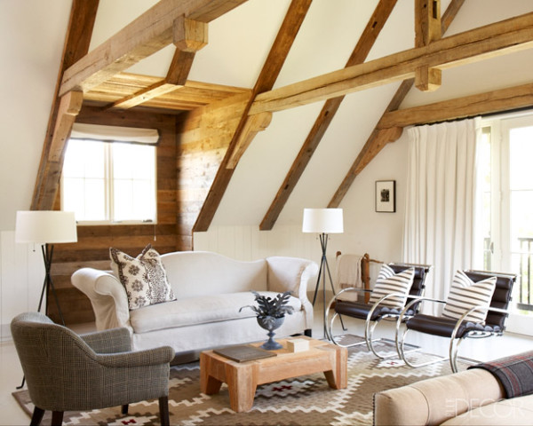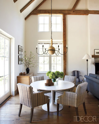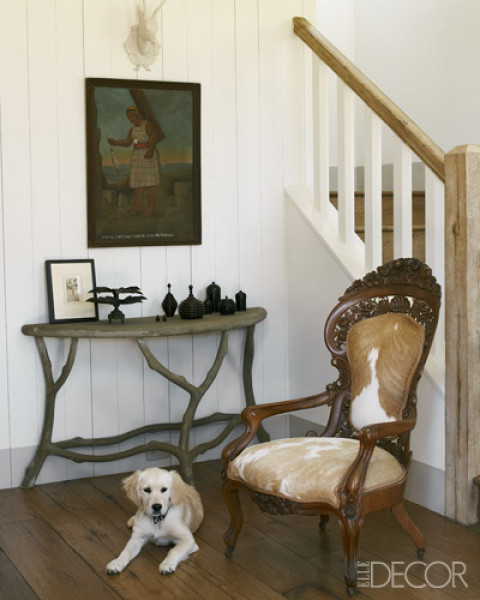 This raw wood table, white walls, the cowhide chair the old Art and even the Lab puppy are all quintessential components of Modern country. |