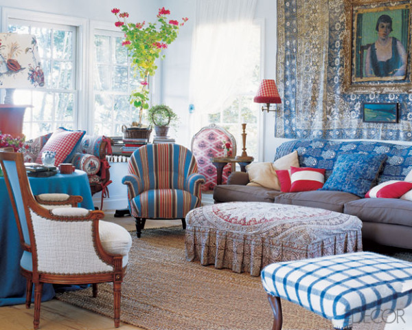 Even zebra velvet and hip zig zag prints can accent a country room.