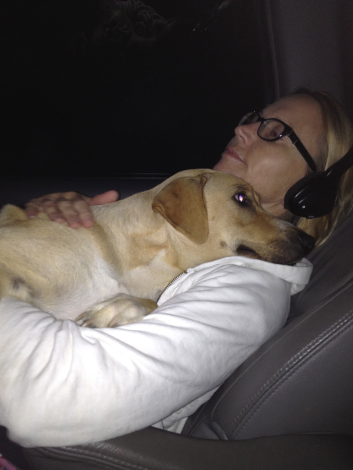 | me and Charlie in my car, last friday night after we lost power. We were watching” Grays Anatomy” on the Car TV..the dogs all in the car with Phoebe and I! |