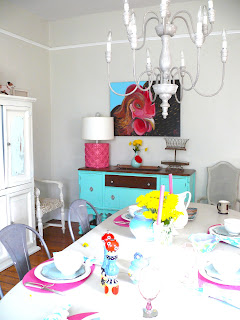 is feminine and i like it that way but we painted our dining chairs this crazy yellow and then repainted them a very light blue almost white recently and it changed the whole vibe of the room. softened it and we love it so much better