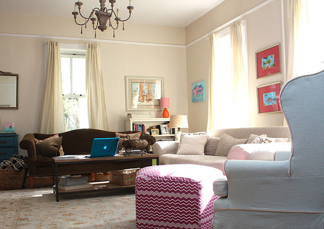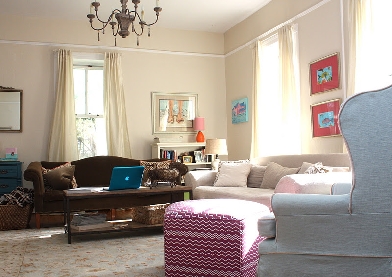 BM Mountain Peak White which is the white I used and LOVE in my kitchen. The fabric on the Chevron Sofa was less than $7.50/yrd! The Pink Zig Zag Pouf is Missoni for Target! |