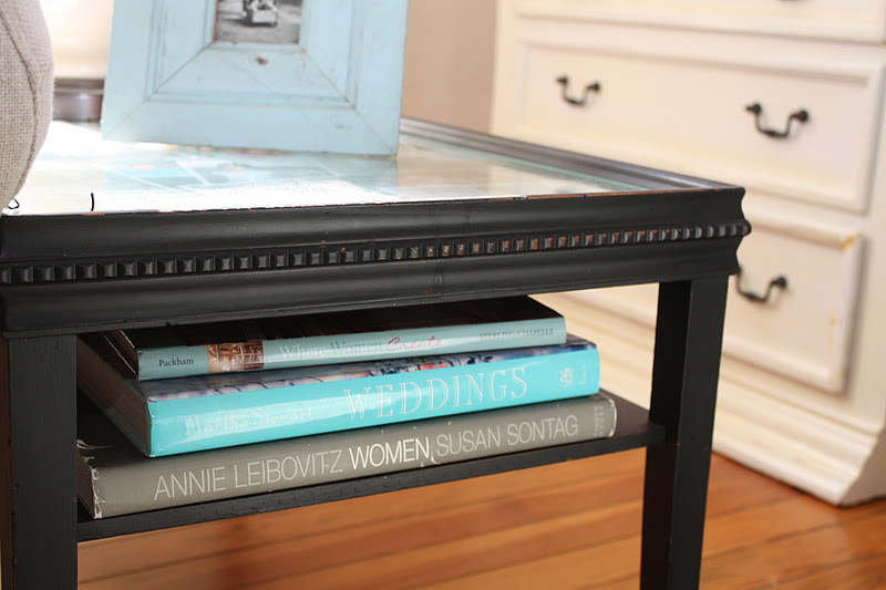 I read that every room (or maybe it was every outfit?) oh well…that it should have ONE item of black. This end table, which was a coffee table, I got at a yard sale fo $5.00 and spray painted satin black. One week later, I found a nearly identical table, also with a glass insert and it lives on the other end of the sofa! They were the answer to my photo clutter problem! |