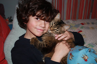 One day, as he was closing in on eight years old, he informed me, “Mom, I have decided what I want to buy with my Hundred dollar bill!” Thinking we were headed to Best Buy for a video game, I tried to remember if I had any coupons tucked away, when he said, “I want to go to the SPCA and buy myself a kitty.”Well, I have never been able to walk out of the SPCA empty handed, and that was not going to change. So his kitty, Lucy Jane, became our third cat, four if you count Fluffy, the cat that Eleven got for her fifth birthday and who has moved in with the quiet retired couple across the street. His new owners do things of which I am incapable, like nailing scrub brushes to chair legs so that he can scratch himself. He is in a better place.