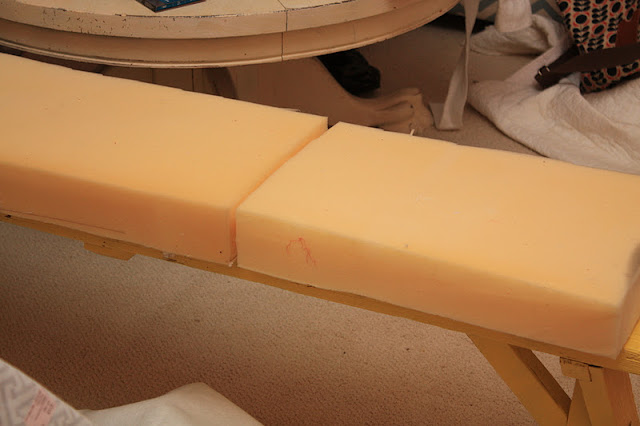 Because I pieced together two pieces of foam, I ended up with a teeny lump, but hey, this is going in MY bedroom, and NO ONE will notice it…In fact…my husband may not even notice that I upholstered it to begin with!!!!