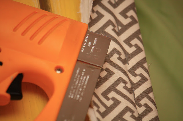 I began stapling by alternating side to side, to make sure the fabric pulled evenly. I discovered that if I kneeled on the bench it would depress the foam, eliminating the need for me to PULL the fabric so hard. I finished the bench this way and it gave me a nice tight pull of the fabric. I got a few lumps, but oh well.