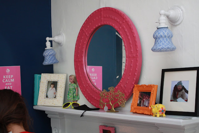 …over the non-working fireplace is the mantle which I also painted Bunny Gray is a pink mirror which was a hand me down that I spray painted hot pink. the blue globes on the sconces used to be on my son’s light fixture, and were in the attic: they are from Lowes from years ago.