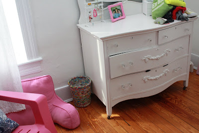 Phoebe had outgrown her dresser, a yard sale find which was better suited to toddler sized clothing, and so after much scouting, I bought this dresser at the Greenwood Country Store, where I have furnished half of my living room. It needed painting.  I sanded and painted the body, with Benjamin Moore Glacier White (yet another kitchen cabinet reject!) but it is the perfect off white for furniture…