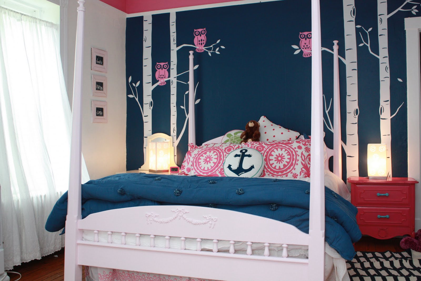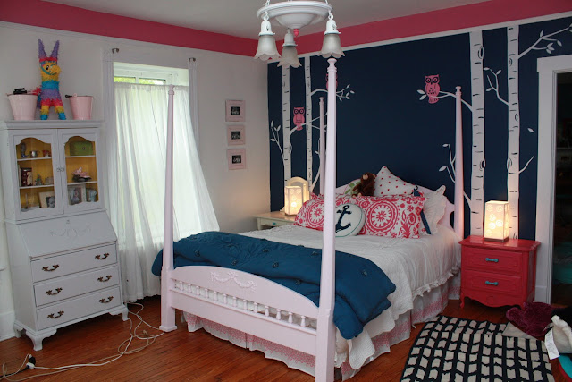 We agonized over the colors. Phoebe wanted the room more grown up and while she was not sure exactly what she wanted, she knew she did NOT want anything too sweet or pastel. She also wanted three walls white and one dark accent wall and stick on trees. Okay.