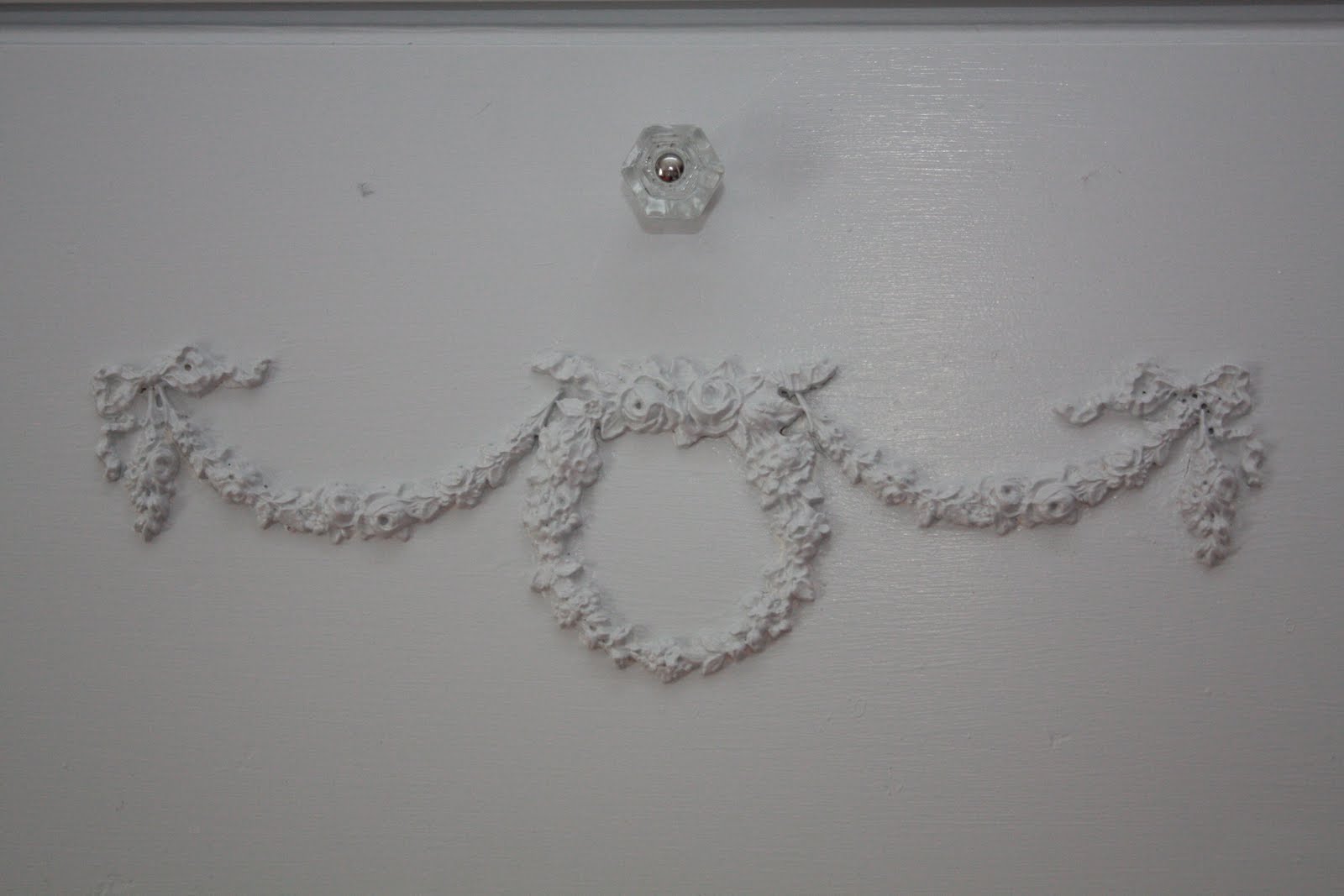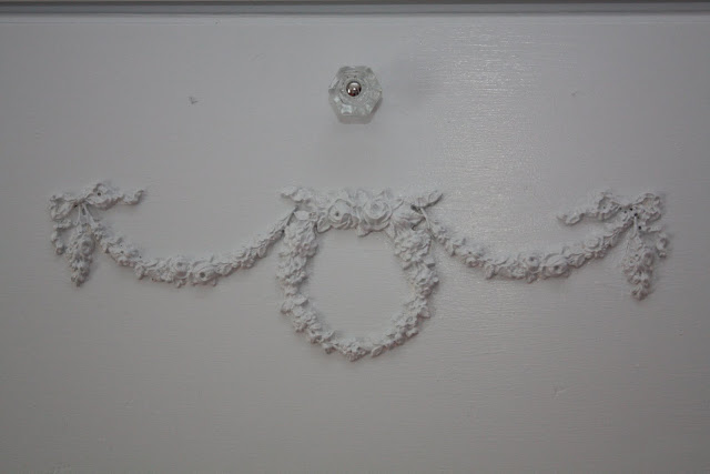 I bought the shabby resin appliques (on the bottom two drawers) on ebay and glued them on the bottom two drawers. (side note) It helps to warm them up first, so they are more pliable, especially if your dresser front is curved, like ours. To do that, I soaked them in hot water. whoops, all the paint on them came off, (paint them last) Then I glued them on with wood glue, I tried Gorilla Glue, but A. it was stuck to my fingers all week and two, it then dries and it oozes out in the hard foamy yuck I did not need. USE ELMERS