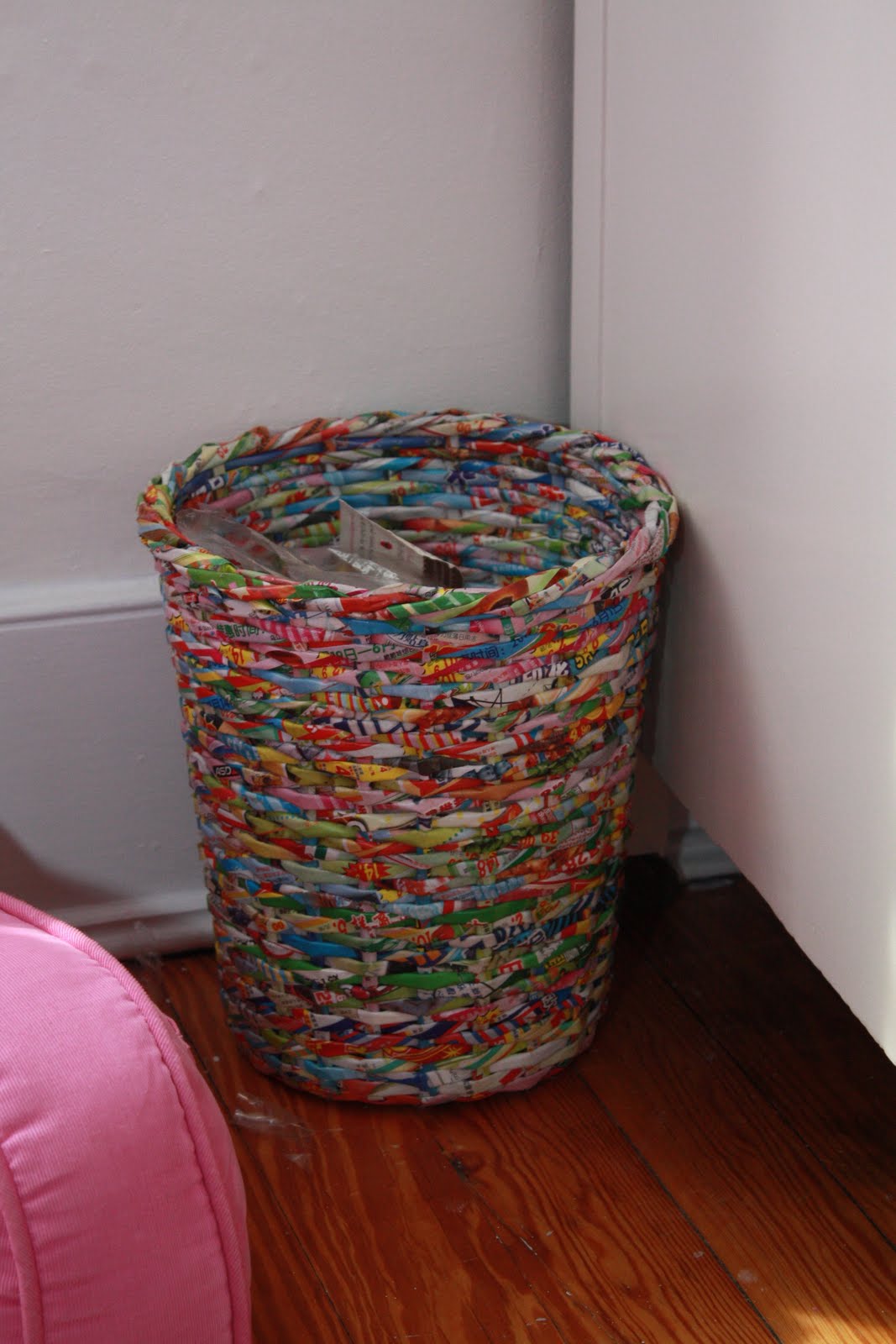 …little things I picked up along the way…like the cute recycled Vietnamese newspaper wastebasket I got from Bed Bath Beyond. I love the colors.