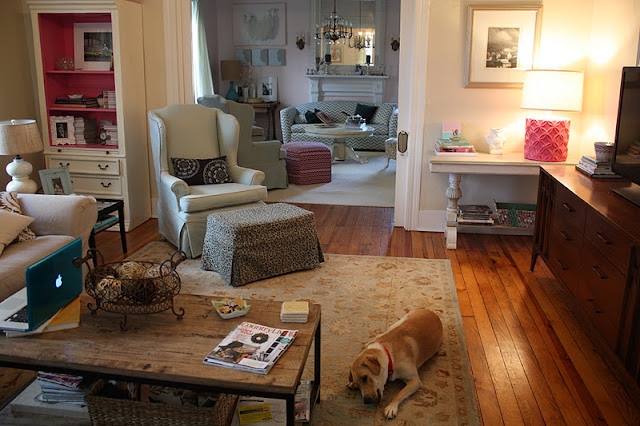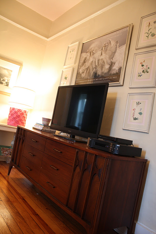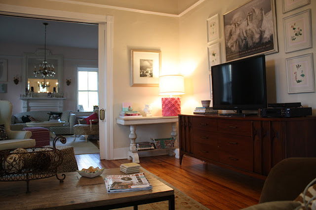 | The table on the right with the Pink Lamp is what the TV WAS on…can you believe it? Oh well, we make it work with what we have…at the time..right! |